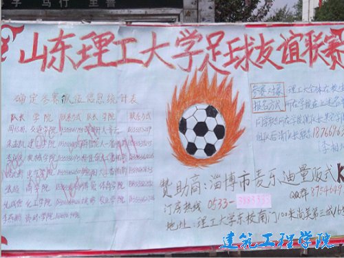 宣传伊始,由会长李相坤以及该社团各干事布置场地。始料未及,展板一经摆出便引来众人围观,顿时展板周围水泄不通,激烈的讨论之后,有12人以队长的身份签了名,组建12支足球联队,有的以公司为单位,有的个人组队。报名的热情也给工作人员以慰藉,同时,灿烂的阳光在他们脸上折射出青年应有的英气。比赛即将分为宣传、初赛、前8强晋级赛、前4强晋级赛、冠亚军晋级赛共计五个环节。