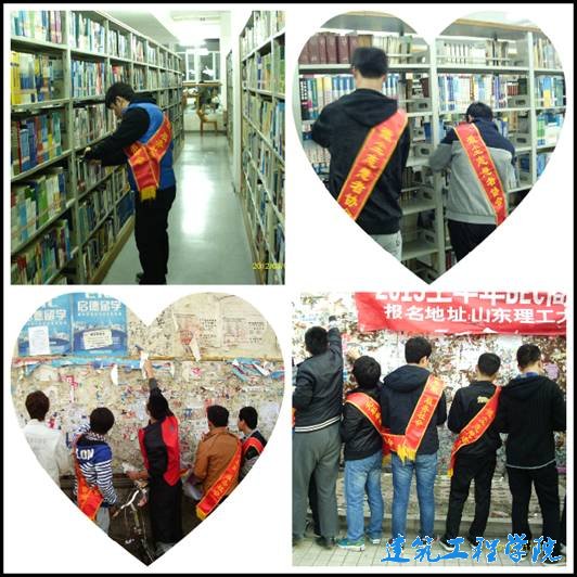 上午9点20分,土木1101班全体同学在三餐西门集合,团支书带领一部分同学去图书馆整理图书,剩下的同学在餐厅附近清除过期的广告。同学们都积极投入到劳动当中,全然忘记了脏和累,每个人的脸上都洋溢着劳动的快乐。
