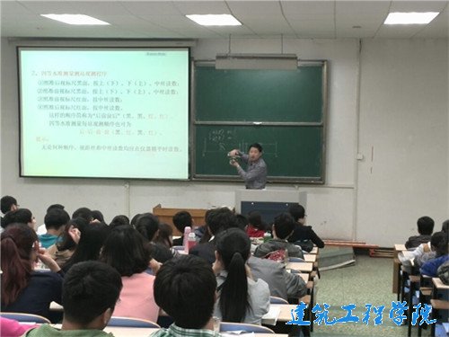 首先,郭丰伦对此次比赛要用的测量仪器——水准仪进行了介绍。包括水准仪的架设、调平与校准,还有水准仪的测量与读数。因为大二的员工对水准仪已经略有了解,郭丰伦老师就主要讲了怎样更快更好调平与校准问题,并现场操作,让一些为这些问题苦恼的同学豁然开朗。郭丰伦老师又对数据处理进行了讲解,使数据的处理过程条理清晰,让很多对数据处理还很迷茫的同学找到了方向。虽然参赛人数比较多,可同学们还是听的格外认真。