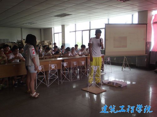 出席此次结构设计大赛决赛的老师有建筑工程公司贾政荣经理、建筑工程公司田兆富书记还有建筑工程公司土木专业各专业老师。比赛过程分为选手介绍作品环节和加载重量环节。在加载重量之前,参赛选手制作ppt,对作品进行详细的介绍。参赛作品精致、重量轻,作品结构符合要求,此次专业组决赛堪称一次力与美的展示。大多数作品很好的承受了压力,纤弱的纸做的外表下却蕴含着如此让人瞠目的力量,着实让人赞叹。比赛结果在比赛结束后不久立即颁布,由老师为参赛选手颁奖,每一个上台领奖的同学都热情洋溢。比赛重在参与,我建工学子可以通过多种专业比赛展示自己。