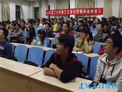刚过6点,就有会员早早来到。不多久,两个教室都坐满了人,总共近400人。7点,见面会准时开始。首先,两个教室各有一个主持人进行开场。因为是新会员们是第一次参加这样的见面会,所以都很热情。接下来,是主讲人对社团具体情况进行讲解。从社团定义、意义、影响等大的方面介绍,然后就是具体讲解建工之家的情况。从2001年社团成立以来,在13年的风雨里,建工之家取得了很多大大小小的荣誉,并在今年4月获得“全国十佳社团”的殊荣。作为一个学术科技型社团,各种专业活动是最大的亮点。从过去社团承办的活动来看,社团的活力显而易见,现在社团正在进行的绿色低碳建筑设计比赛也是一个校重点活动。最后是社联主席杨洪蛟和社团团长孙振慷慨激昂的演讲。他们从个人发展,社团的长远角度等给新会员们上了生动的一课,并且对新一届的会员们表达了自己的信心。情到激动处,会员们也跟着振奋精神。