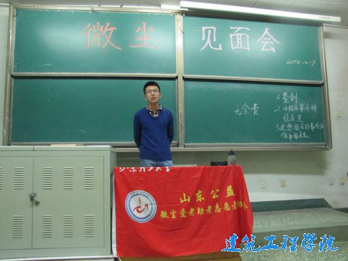 见面会主要是由微尘者协会会长刘志宇主持,为了缓解现场的紧张气氛,他以幽默风趣的方式开场,向大家介绍社团的总体情况,侃侃而谈,时而自夸,时而自嘲。现场的气氛一下子就活跃起来,笑声不断,掌声阵阵,还时不时有喝彩声。接下来秘书处负责人、外联部部长、宣传部部长、志愿服务部部长向大家介绍了各个部门主要负责的工作,同时鼓励大家参与骨干纳新,成为社团工作者,为同学们服务,同时锻炼自己,提高自己的工作能力。在老会员们的鼓励下,新会员们纷纷走上讲台,参加竞选。他们详细介绍自己,尽全力向大家展示自己,个个“身手不凡”,可谓人才济济。