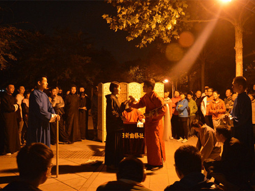 曲艺社将经典曲目《江门寺》进行改编,演出了一场令人忍俊不禁的闹剧。改编的另一个特色是在里面加入了大量的原创戏剧台词。通过演员们的演绎,普通的台词和戏剧之间完美过渡结合,而两种风格的转换也让演出更丰富多彩,充满趣味,更能表现出演出对中国传统文化的传承,演员的的戏剧唱功也是让人眼前一亮。除了笑声,本次演出带给观众的还有更有内涵的东西,即讽刺现在社会上“官官相护”的现象。剧中如刘公道,如九千岁,利用职务之便而干出的令人啼笑皆非的事满剧皆是。九千岁分明是净身的公公,却频频流连与风月场所,只买“参观票”。而刘公道连知县来投文都侧面告诉他里面需要加点“东西”。这种演绎方式通过说者有心,听者晓义的方式,一语双关,在提高幽默度的同时,表现了对这种现象的讽刺。