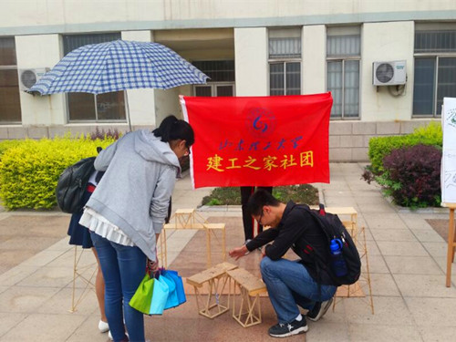 此次模型展览主要分为三部分,第一部分是观看建筑模型,各个模型都摆放在具体位置,都明确归类,模型上都有详细的介绍,具体说明承载力为多少。第二部分是模型讲解,主要由建工之家的陈翔羽进行讲解,他周到细致的讲解吸引了无数的同学前来参观,他把各个模型受力情况进行了明确的分析与讲解,并解答了许多同学的疑惑,从而帮助了许多不是本专业但对次专业有疑惑的同学。第三部分是体验模型,就是亲身体验,同学们站在受力模型上,不同的模型承载了不同同学的体重,从而达到了意想不到的效果。