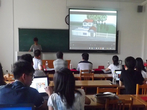 比赛开始后,首先由主持人介绍评委老师,随后由杨光杰解析评分标准和比赛要求。杨老师着重指出两个方面,一是项目的可行度,确保设计方案与当地地域特点紧密结合,在技术、经济上具有可行性,并符合相关标准的规范要求;另一项则是原创性,要求参赛选手们不得抄袭及使用他人作品,一经发现即取消参赛资格,并进行通报批评。之后,竞赛正式开始,参赛选手们按照事先编号依次进行作品展示,并回答评委老师的相关问题。参选选手们就淄博当地的人文、地形、气候特点,分别就自己设计的古窑村陶琉文化、“山水田园”美丽土泉村、生态村镇住宅、农村低能耗院落式住宅设计等方案做了简要讲解,并就评委老师的问题做了积极的回答。