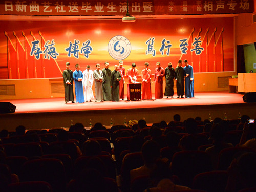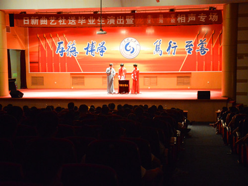 6月2日晚,日新曲艺社送毕业生演出暨朱昌宇王海蛟相声专场在三号楼报告厅成功举行。日新曲艺社团长王义杰主持了此次表演,大四演员朱昌宇,王海蛟担任了此次比赛的主演,全场坐无虚席,表演者说学逗唱,观众连声叫好。