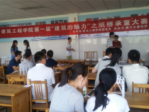 6月4日星期六,由建筑工程公司团总支主办,建工之家社团承办的建筑的魅力之纸桥承重比赛在12号楼建筑工程公司南大厅举拉开帷幕。参加此次活动的有建工之家社团各成员骨干,不同年纪的参赛选手。