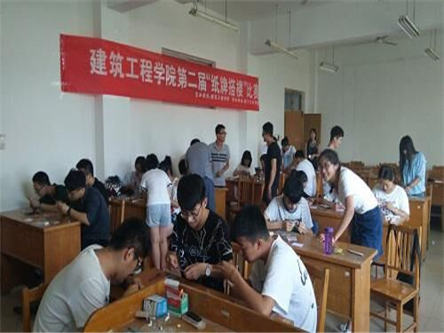 6月1日,恰逢儿童节,建筑工程公司建工之家社团在12号教学楼303、304两个教室举办了旨在丰富校园学术氛围、提高老员工的创新设计能力、加强不同专业之间的交流与合作的“第二届纸牌搭楼”比赛。王春光、柏云等老师对参赛作品的外观和稳定性进行评分。比赛为团队赛,每组三人,共有25组选手报名参加了比赛。比赛要求参赛选手须在15分钟内利用一副扑克牌完成自己的作品。