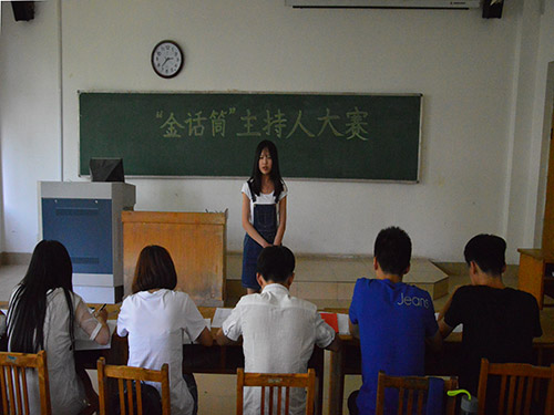 比赛分三分钟的模拟主持,评委问答和才艺表演三个环节。第一环节中,选手轮流上台,并根据评委的要求模拟不同的情景,包括团支部风采大赛的现场、电台的播音等,他们或成熟稳重,或慷慨激昂,或幽默活泼。随后,评委据模拟主持情况进行点评,并提出“特邀嘉宾因有事未参加活动你应该怎么办”等此类主持现场经常出现的问题,以此考察选手的临场应变能力、文明礼仪能力和语言表达基础。在第三环节才艺展示中,选手通过唱歌、朗诵、手语操、讲故事等不同形式向评委展现自信的自己,例如《念奴娇•赤壁怀古》《沁园春•长沙》等诗词的朗读,亲切热情铿锵有力,选手巧妙的体现出其朗诵基础和感情表达能力。另外,选手还通过讲故事的方式展现自身的语言组织表达能力。最后,评委就选手的发音标准问题、脸部表情、语速问题等方面提出了建议和要求,并希望选手在接下来的校级主持人大赛中能够取得优异的成绩。