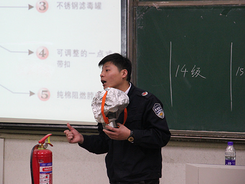 随后,他表示,这些火灾事故都事出有因,事故的发生源自人们缺乏使用安全救生器具的基本知识。他介绍到,浓烟是火灾事故中的头号元凶,浓烟致人死亡不仅是因为一氧化碳中毒,它的出现会严重影响人们视线,使人于火场中迷失方向。因此,防烟的必要性毋庸置疑。他还详细介绍多种火灾逃生的技巧,逃离火场时应保持身体降低,紧贴墙壁,以墙壁为引导迅速逃离现场。他以油锅起火为例,向同学们具体介绍了灭火毯的使用方法,它具有防火隔热的特性,逃生时只要将毯子裹于全身就能够得到很好的保护。他表示电器火灾是火灾事故易发类型,因此同学们需要时刻牢记“人走电断”的常识。