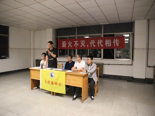 为检验同学们近一学期以来太极拳的学习成果,促进老员工强身健体。5月12日晚7点半,建筑工程公司太极拳协会于12号教学楼南大厅举办“太极·薪火”太极拳比武大赛。此次比赛由指导老师苗凤林及三位大二的同学担任评委。