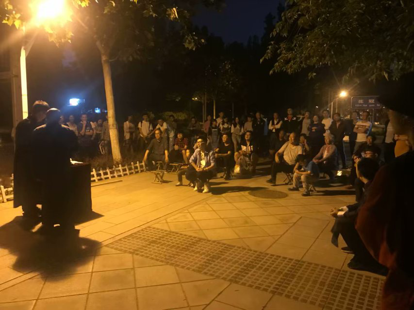 为响应公司丰富校园文化生活的号召,充实同学们的课余文化生活,5月12日晚上七点,日新曲艺社周六路演在第三体育场花冠路旁路灯下准时撂地开场。昏暗的灯光抵挡不住观众、演员们的热情,小小的方桌前被围得是水泄不通,不论站着的、坐着的还是蹲着的;小孩子、成年人还是老年人,个个听得都是如痴如醉。