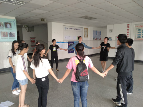 活动伊始,曲明军对此次活动的流程作了简要说明并向大家介绍了此次活动中开展游戏“情有千千结”的规则。紧接着,游戏开始,同学们分为两组,手牵手围成两个大圈,并被要求记住自己左右两边的人,然后都向圈内随意走动,停止运动后找到刚开始在自己身边的人,保持原地不动,重新牵手。游戏过程中,两个小组毫不示弱,相互比拼,同学们团结协作,积极配合,想尽一切办法,尽自己最大的努力把这些结解开,恢复到正常的牵手状态,期间,同学们紧张严肃地对待比赛,也会发生一些趣事,引得同学们阵阵发笑,使活动氛围变得活跃。随后,同学们围在一起讨论,进行最后的总结,曲明军表示,此次活动主要考察大家的团队协作能力,考察部分同学具有的组织领导能力,并且对提高同学们的团队合作能力,增强同学们的集体荣誉感也有一定的促进作用。同学们也表示,虽然过程有点困难,但能考验同学之间的默契程度,拉近了同学之间的关系,使彼此之间的凝聚力增强。活动最后,曲明军表示,希望大家能通过此次活动得到一定的收获,并把它们充分运用到实际生活中。