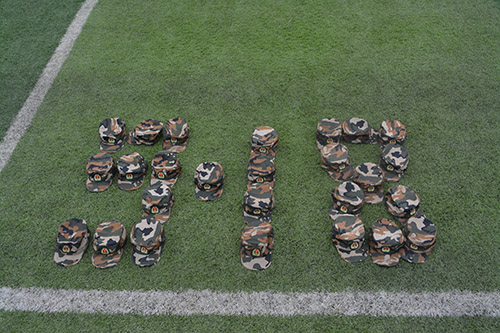 军训现场还组织了“摆字形”的纪念活动。在军训教官的指导下,同学们合力用自己的军帽摆出“九一八”的字形。横行在绿茵场上的“九一八”字样是军训新生们“铭记历史,不辱使命”的宣誓。