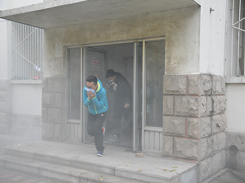 在培训会结束后,丰硕和耿连娜组织所有同学在21、22号宿舍楼进行消防逃生演练。哨声一响,同学们口捂湿润的毛巾从安全出口跑出,用时两分三十秒成功做到全员逃生完毕。