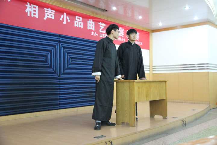 活动伊始,各个队伍进行抽签决定比赛顺序,主持人根据抽签又再次核对了节目顺序,以确保比赛活动的顺利进行。第一个节目是由季玥和臧文华两位同学带来的相声《小偷公司》,逗哏捧哏二位演员戏侃评委,在舞台上落落大方,起到了非常不错的开场效果。伴随着台下热烈的掌声,王沛琦和穆峥带来的经典相声《论捧逗》、王林炟和康九锡的相声《有话好好说》这两个节目更是将现场氛围带入了一个高潮,台下每一位观众都意犹未尽,深深沉醉其中。而第四个相声节目《我为歌狂》则是由老戏骨许新港与黑马钟浩玮共台演出,起到了不错的舞台效果。而后则由两位老戏骨刘锦源和孟令涛共同表演相声节目《礼仪漫谈》,更是吸引了全场的目光,不管是台下的观众评委还是结束表演的相声演员,都报以了热烈的掌声。随着由王启元和陈梦海二位相声新人的表演《谁更聪明》的结束,比赛也逐渐步入了尾声。最后一场节目不同于前面的表演形式,是采用了小品形式表演的《作家之死》,在引来大家爆笑的同时,也引发着大家的深思。至此,表演结束。演员们一起上台鞠躬致谢并合影留念,观众们都依依不舍,用热烈的掌声表示了对表演者的感谢。