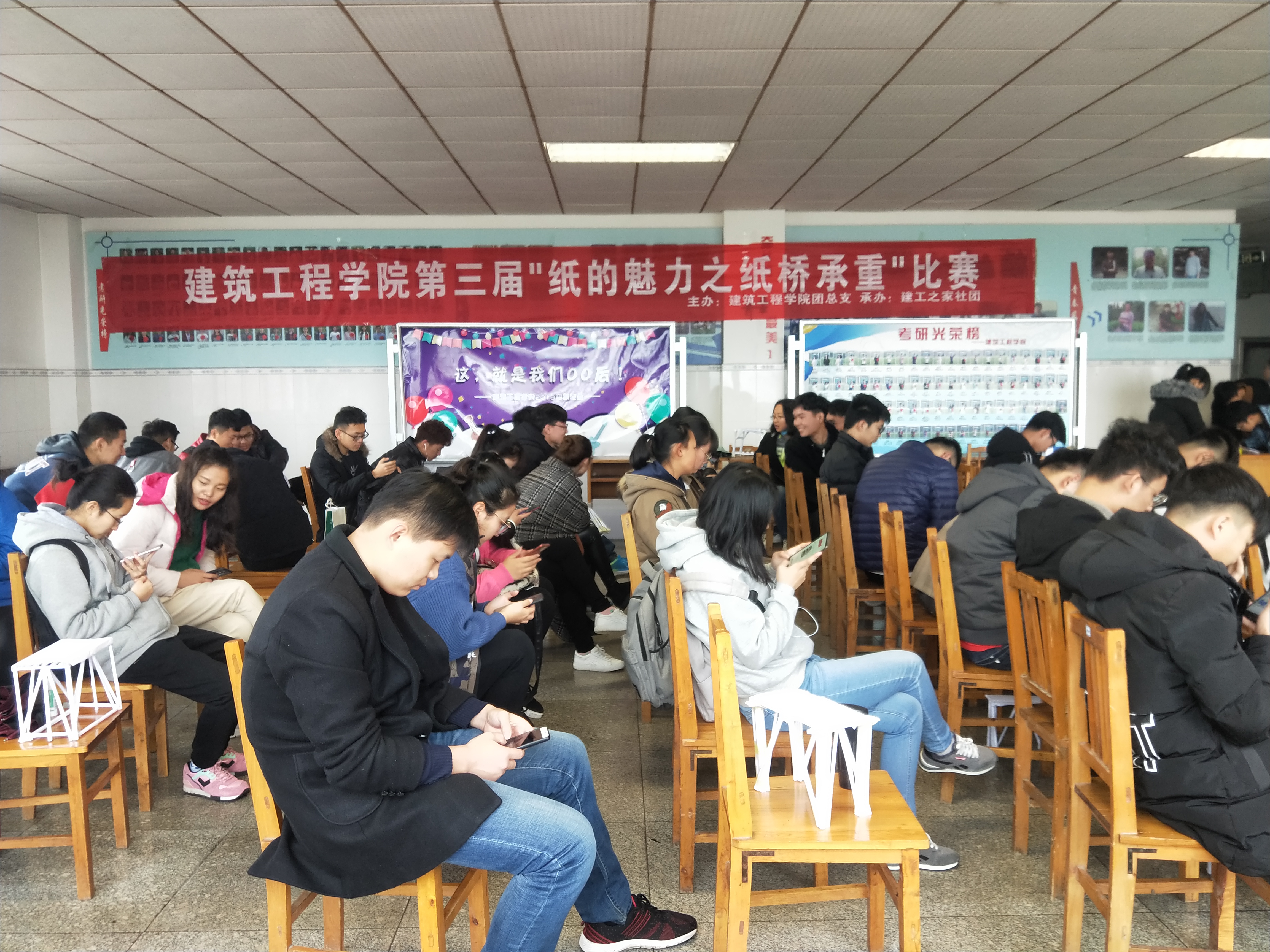 为提升老员工对专业的认同感,培育结构设计理念,加强动手能力和团队协作意识,深化同学们对结构设计类比赛的认识。12月2日下午2时,建筑工程公司建工之家社团于12号教学楼301教室和南大厅举办纸的魅力之纸桥承重比赛。本次比赛总计48组,共一百余名员工参加。