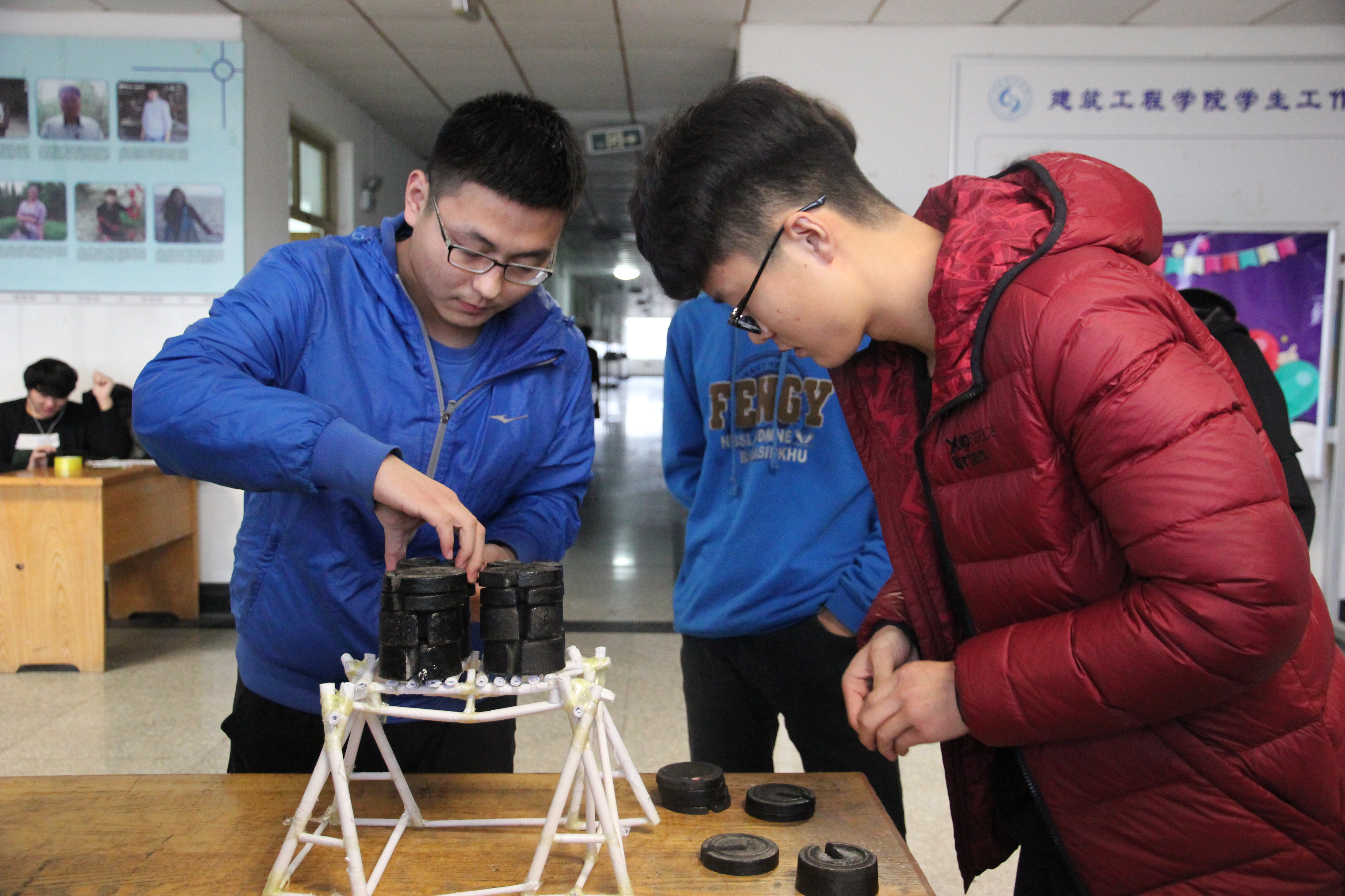 本次竞赛要求用普通的A4纸作为材料搭建一座纸桥,并在规定的时间内充分展现自己在知识积累、创意设计、动手制作等各方面的综合能力。各作品由评委按照美观、自重、承重三方面打分。比赛开始前,同学们统一签到,然后按照签到顺序展示自己的作品。作品先进行自重测量和美观评分,同学们拿着自己的作品走进评分房间,有的显得很紧张,有的显得极其自信。等到前两个环节结束后,各作品再在南大厅进行最紧张刺激的得承重测量。为保证比赛的严谨性和公平性,每个作品承重时间必须控制在三分钟之内,且只有两次测试机会。测试过程只要砝码在桥上保持10秒钟即成绩有效。同学们在自己的桥上放上砝码,小小的纸桥承载了几公斤甚至几十公斤的砝码。有的同学求稳,只在纸桥上放上了适量的砝码,而有的同学太过心急,在纸桥上放了过量的砝码,最后在测试环节功亏一篑。这说明只有在三方面都取得较好的成绩才能获得最后的胜利。