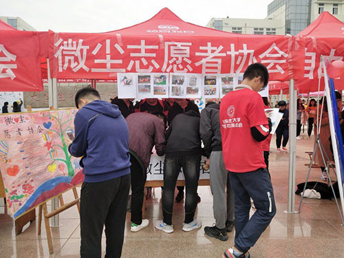 各个社团都很优秀,但这其中的“微尘志愿者协会”格外耀眼。微尘的宗旨在于服务于同学,为社会做一些力所能及的公益,同时调动同学们的积极性,让同学们在学习之余多一些锻炼。目前设有的活动有“背包驿站”、“福利院活动”以及各种社区服务活动。作为一个公益性社团,微尘并没有很出彩的节目,但他们的那种积极性以及作为一位志愿者的风范还是吸引了很多的人,报名的现场极其的火爆,此次纳新共招了300余名会员,相比于去年,纳新人数明显增多,相信会员们在以后的实践活动中会有更吸引人的特色。