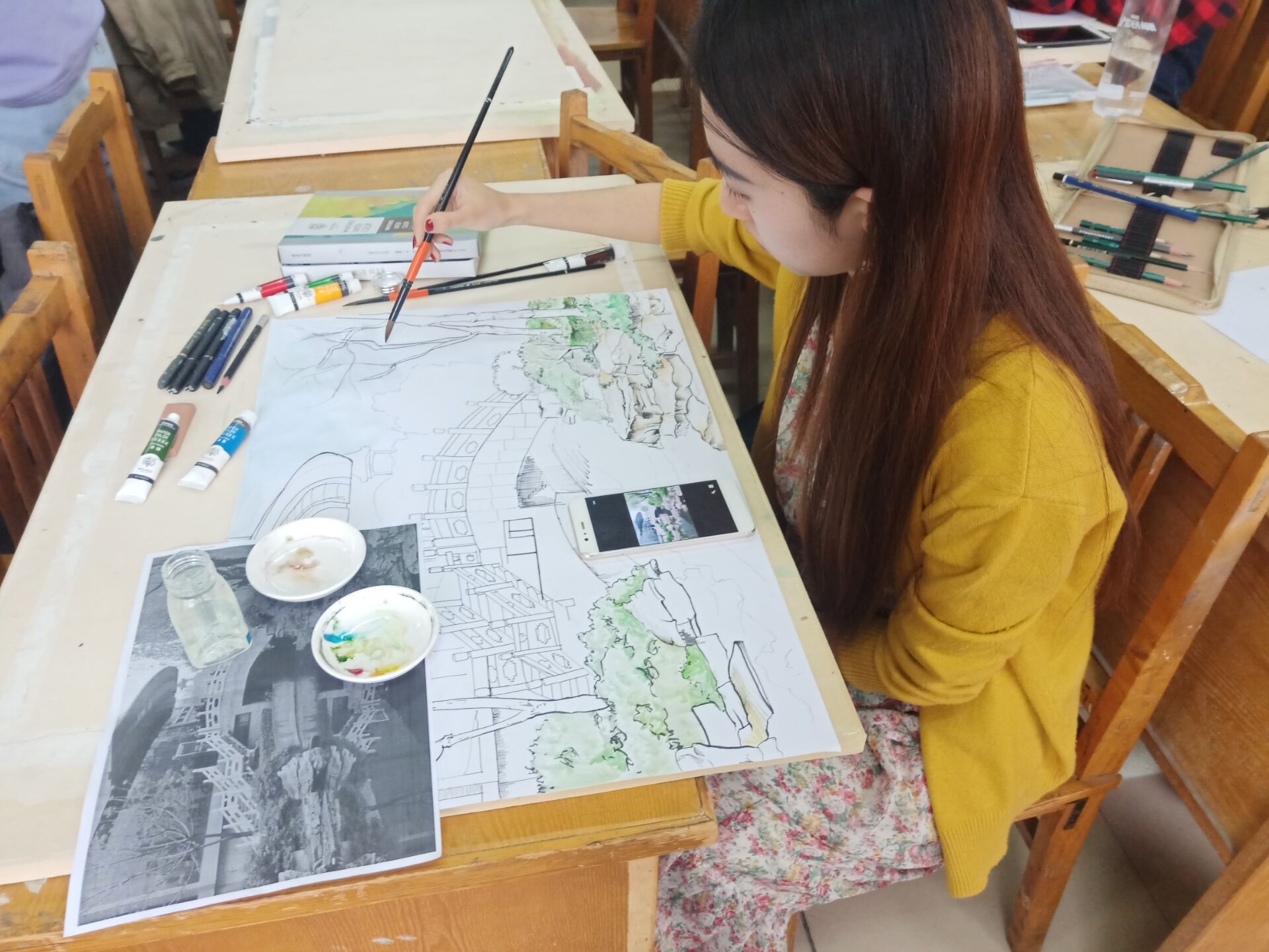 比赛开始前,此次活动的负责人赵国庆为参赛的同学分发了纸质的打印的照片,照片就是这次比赛将要写生的内容,还派发了写生所需的纸张和画板,画材则是由同学们自己准备的。参赛的同学们跃跃欲试,每一位同学都做了充足的准备,画具都已经整整齐齐地摆在了桌上。比赛正式开始的时候,参赛选手们聚精会神进行作画,有很多同学为了更好地看到画纸的全局以便写生得更为准确,站起来作画。每一位同学都全神贯注,眼睛不离自己的画板和照片。每一位同学都尽力把自己的最高水平发挥出来同时此次比赛还展示了“友谊第一,比赛第二”,参赛的同学们怀着对写生的热爱而来,比赛前相互交流经验,分享画材,这更像一场“以武会友”的比赛。活动后半段,开始有同学陆陆续续的交上自己的作品,每一幅作品都是精致的,转眼间,时间到了下午六点,活动结束,大家纷纷交上了自己的作品,他们所做的每一幅作品都是用心的,不管比赛结果如何,他们的态度也是值得鼓励与学习的。