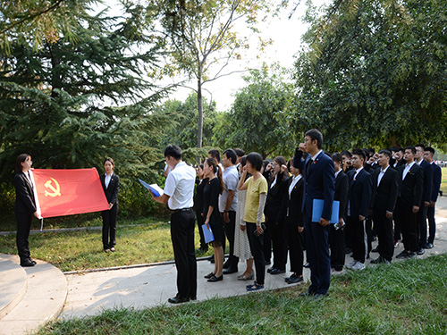随后,员工代表向冯思广烈士敬献鲜花,全体成员在雕像前默哀一分钟,深情的思念和崇高的敬意在现场每一位成员的心中油然而生。最后,辅导员杨瑞带领大家重温入党誓词,铿锵有力的入党誓词响彻每一个角落,全体成员将用坚定的信念和坚强的意志捍卫着烈士们的荣誉,用坚持不懈的努力传承烈士们的精神。