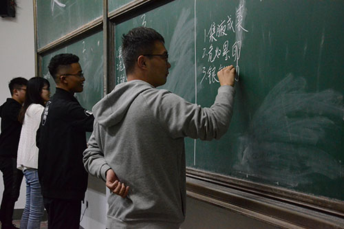 比赛伊始,主持人向参赛选手讲解了此次比赛的意义,强调参赛选手一定要重视比赛,比赛中成绩优异者会被选拔出参加高一级的比赛,有机会获得更高的荣誉。紧接着,他又详细讲解了比赛的有关规则,并要求选手们在比赛中要遵守比赛规则,并严格要求自己。随后,笔试答题开始,参赛选手需要在半个小时内作答试卷中的题目,笔试答题期间,会有工作人员在教室内监考,维持比赛秩序。作答过程中,选手们仔细阅读试题给出的拼音提示,认真揣摩并将答案端正地写在答题纸上。笔试之后是团队答题,团体比赛每轮各队派出一名选手,主持人给出字词拼音,由队伍代表在黑板上的指定区域进行书写,每轮结束后由监督员统计正确答案并进行打分。比赛氛围十分热烈,除了全神贯注参与答题的队伍代表,台下的观众们也纷纷紧跟比赛节奏,尝试写下自己的回答。