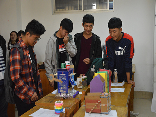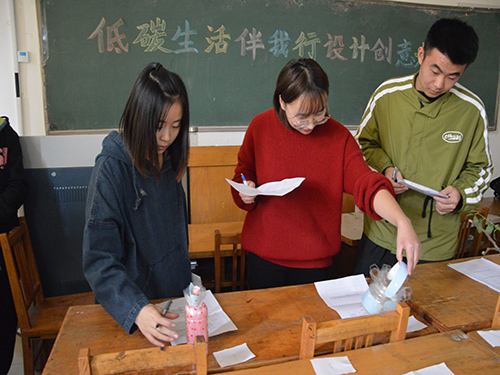 此次活动旨在通过以废旧物品为原材料,适当加入其他辅助材料并加以创作成品,在提升创新意识及动手能力的同时,进一步加深同学们对低碳节约的了解,将勤俭节约的优良作风根深蒂固。活动开始前,参赛的同学提前到达301教室进行签到,并且将参赛作品放在教室里的相应位置。待参赛作品全部放置完毕后,进行自由观看参赛作品环节。参赛作品风格各异,有废旧纸盒制作的多功能收纳盒、旧报纸制作的精美笔筒、废弃硬纸箱制作的多功能存钱罐以及塑料空瓶制作的花瓶、冰淇淋木棒制作的彩色木屋装饰品等多种集环保美观于一体的精美作品。在观看的过程中,参赛人员积极详细地向参观人员介绍其创作作品的性能与特点。其中也不乏具有体验功能的作品,参观人员在制作人的引导下体验并使用作品,充满乐趣,使同学们深入体会了低碳环保的意义。自由观看后,活动评审就每一份参赛作品进行现场点评打分。活动评审结果采用打分制,去掉最高分和最低分后取各评委的平均值,工作人员将评审对各个作品的评审结果进行整理,最终比赛结果以评审团的评审结果为定。