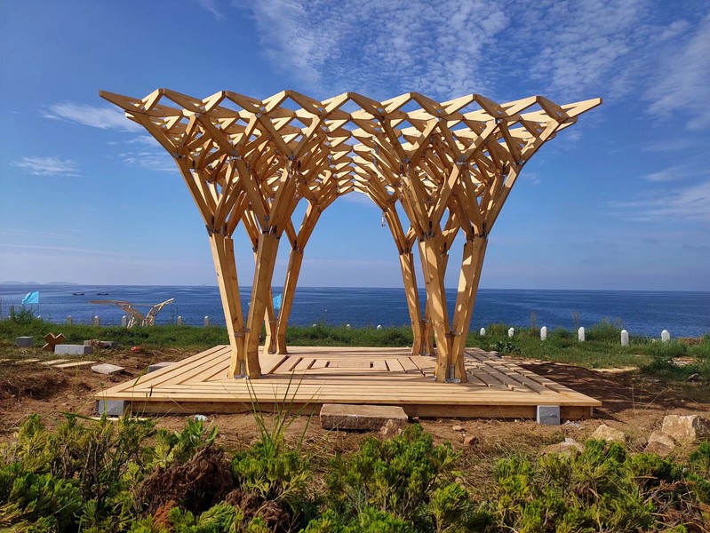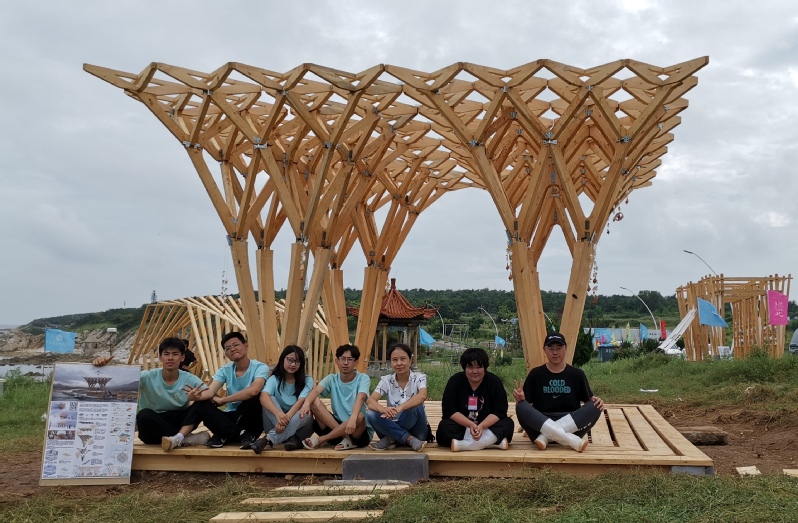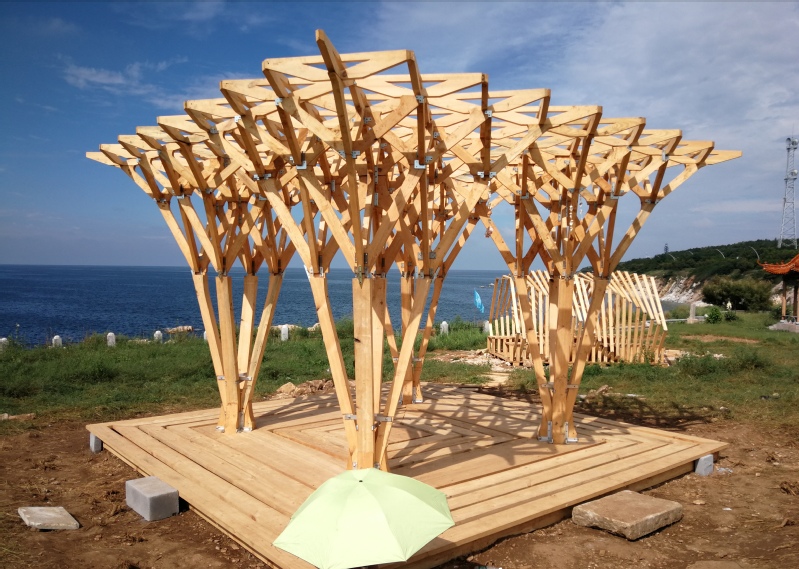 公司作品《参天》灵感源自树木,从“V型木构件出发,仿照树枝生长结构,抽芽、分支、交错、繁茂。历经半年的方案创作、四天的风雨兼程、昼夜搭建,利用木材、金属等材料,创建出一座艺术的木构景观建筑!(孙娜)