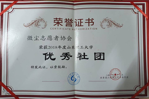 “建工之星”评比中,荣获“公益之星”称号,2017届社团评比中被评为“优秀社团”,2018届社团评比中被评为“优秀社团”,2019届社团评比中被评为“优秀社团”,三下乡社会实践重点团队。