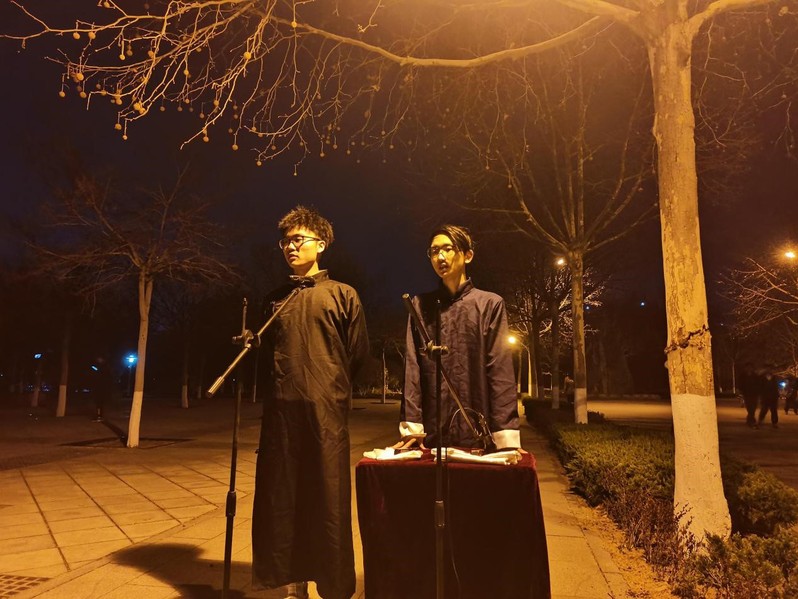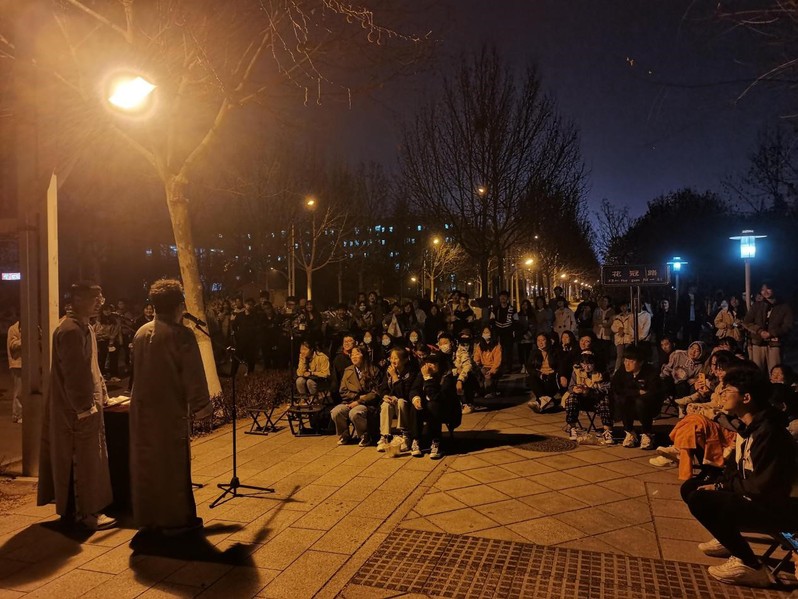 3月13日晚,日新曲艺社在第三体育场南侧举行二零二一年开箱演出,并在建工社团联合会官方QQ进行现场直播,参演人员为日新曲艺社常驻志愿者。