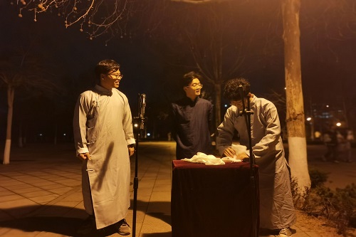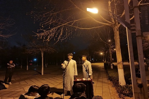 3月20日晚,日新曲艺社于第三体育场南侧举行路演,参演人员为日新曲艺社常驻志愿者。