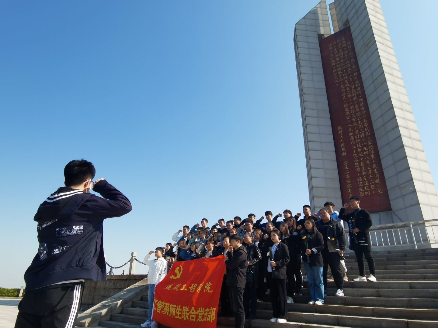 活动第二项:重温入党誓词,忆初心,守初心。全体师生党员及入党积极分子在革命烈士纪念碑前整齐列队,凝视党旗,庄严地举起右拳,共同重温了入党誓词。在师生党员慷慨激昂、掷地有声的誓言中,一位位革命英雄的伟岸身影在眼前不断闪现,一场场民族气节的战火硝烟始终萦绕在脑海,青年学子坚定的初心和信念也在庄严的纪念广场上久久回响。