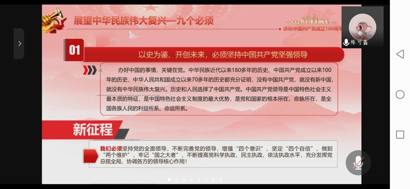 陈可鑫向全体同学介绍展望中华民族伟大复兴的九个必须:必须坚持中国共产党坚强领导、必须团结带领中国人民不断为美好生活而奋斗、必须不断推动构建人类命运共同体、必须继续推进马克思主义中国化、必须进行具有许多新的历史特点的伟大斗争、必须坚持和发展中国特色社会主义、必须加强中华儿女大团结、必须加快国防和军队现代化、必须不断推进党的建设新的伟大工程。