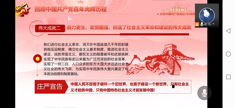 安志超以四个伟大成就为出发点带领全体同学回顾中国共产党百年光辉历程。他指出,为了实现中华民族伟大复兴,中国共产党团结带领中国人民,浴血奋战、百折不挠,创造了新民主主义革命的伟大成就;自力更生、发愤图强,创造了社会主义革命和建设的伟大成就;解放思想、锐意进取,创造了改革开放和社会主义现代化建设的伟大成就;自信自强、守正创新,统揽伟大斗争、伟大工程、伟大事业、伟大梦想,创造了新时代中国特色社会主义的伟大成就。