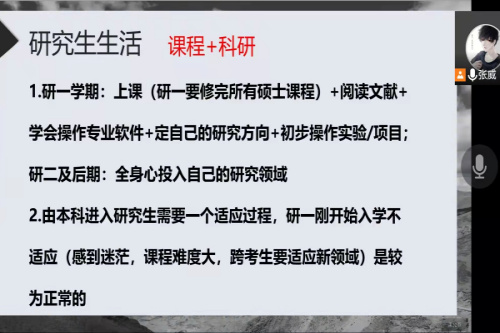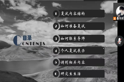 会上,张威首先详细讲解了复试内容、如何准备复试、如何联系导师、个人展示等相关知识和经验,一一为同学们分析专业课、英语、复试自由提问等环节常遇到的问题以及解决策略。其次,在调剂相关内容方面,张威向同学们介绍了近几年调剂情况,同时强调了调剂过程中的注意事项。张威表示,考研调剂非常考验同学们的耐心,希望同学们在有限的时间内开拓信息源,收集更多调剂信息,互相分享。在考研形式愈发严峻以及就业难的背景下,一定抓住机会调剂,缘自己的研究生梦。最后,张威简单分享了研究生的生活学习与后续发展,为考研学生指明学习方向。同时,张威不断强调要以良好的心态去对待复试、调剂,相信勤能补拙。随后,同学们踊跃提问,张威依次给予解答。