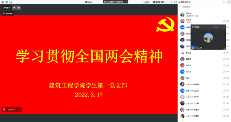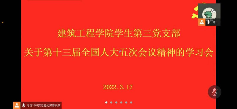 为了学习贯彻十三届全国人大五次会议精神,团结一心防控疫情,落实防控工作措施,3月17日下午,公司第一、第二、第三党支部组织学习第十三届全国人大五次会议精神在线上召开双周学习会,员工第一党支部书记王凯旋主持,研究生党支部书记李聪、员工第二党支部书记陈秋月、员工第三党支部书记史金丽以及2018届、2019届全体党员参加。