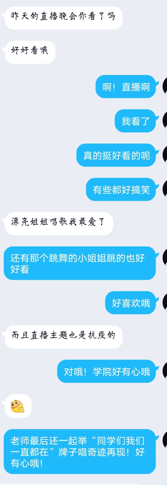 “网红”主持人幽默风趣的开场拉开了直播帷幕。开篇校园十佳歌手一首青春动感的歌曲《new boy》奠定了整场直播热烈欢快的基调,线上互动一片火热。歌曲《孤勇者》坚毅豪迈的歌词鼓足了同学们对抗疫情的勇气,电子钢琴独奏《克罗地亚狂想曲》激昂高亢的旋律展现了同学们战胜疫情的决心,现代舞《Forever Young》活泼动感的舞步展示了同学们的青春活力,《新疆舞》优美曼妙的舞姿带大家领略异域风情,歌曲《说了再见》《你还要我怎样》《You raise me up》饱含深情的歌声让大家深深陶醉,辅导员动情演绎的歌曲《蜗牛》,将不畏困难奋力向前的正能量传递给直播间的每一位同学。师生合唱《彩虹》让大家感受到师生之间的亲密无间,也告诉大家风雨过后会有彩虹。公司全体在校辅导员合唱的歌曲《奇迹再现》,铿锵的旋律、欢快的歌声,感染着直播间的每一个人。全体辅导员将印有文字的纸张拼接成“同学们,我们一直都在”暖心而又坚定的话,将整场直播推向高潮。直播过程中还穿插福袋、评论截图等抽奖环节,整场线上表演在欢乐、热烈、有序的氛围中进行。
