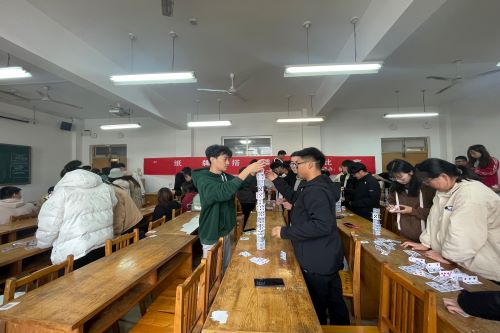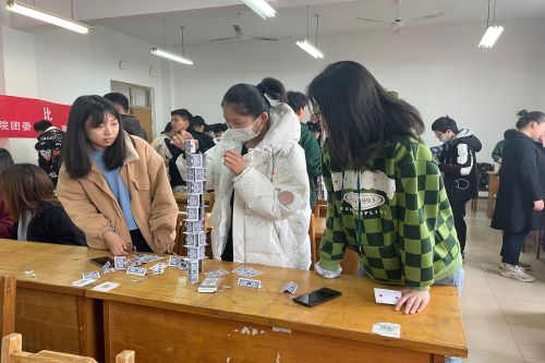 活动一经发布,就受到了同学们的广泛关注,活动以小组合作的形式进行,要求参赛队伍在规定时间内完成纸牌搭建。活动伊始,主持人对参赛人员的到来表示热烈的欢迎,并对此次比赛的规则以及评分标准进行了详细的说明。活动正式开始后,由社团给每个小组发放比赛道具纸牌,并进行半小时倒计时。在比赛过程中,每支队伍分工明确,配合默契,有的队伍选择先夯实基础再往上搭建,有的队伍则巧妙地把牌对折再进行搭建,各组参赛人员都大胆创新,尽显神通,一座座独特美观的塔牌在他们灵巧的双手中呈现。每队搭建完成后,由评委们为其塔牌高度进行测量,并根据各队伍搭建塔牌的完成时间、塔牌的高度以及美观程度进行评选。在此次比赛中,评委们秉持着公平公正的原则进行评分,最终共有八支队伍获得此次比赛的胜利,并将颁发获奖证书。