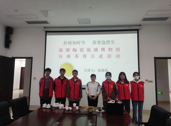 为了迎接中国二十四节气之一——谷雨的到来,弘扬中华优秀传统文化,4月15日上午,w66利来旗舰厅微尘志愿者协会参加淄博市陶瓷琉璃博物馆举办的“好雨知时节,茶香盎然生”——陶琉馆谷雨茶饮公益活动,茶艺师兼任至简茶馆馆主高燕铭担任此次活动的主讲人。