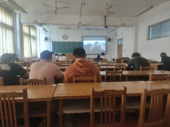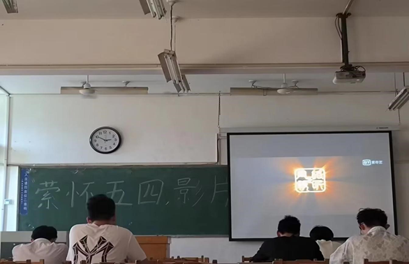 活动开始前,活动负责人王金昶提前到达活动场地准备桌椅,打开并检查多媒体是否能够正常使用,并组织参加活动的同学们有序完成签到。活动正式开始,王金昶向同学们简单介绍五四运动及其意义以及该电影发生的时代背景。活动过程中,王金昶和大家一起观看以讲述志愿垦荒、西部支教、公益助学三个不同年代的热血青春故事为主的电影《我和我的青春》,并对电影中部分情节如:农垦队员面临北大荒的极端气候依然不惧艰险、攻坚克难;支教老师教授农村员工唱歌,师生之间的温馨相处;知识青年寻找资助好人等事件进行互动,同学们积极踊跃分享自己对电影情节的感悟。观影结束后,同学们自觉带走身边的垃圾并帮助王金昶整理好活动现场后依次安静有序离场。