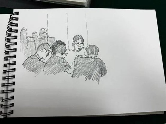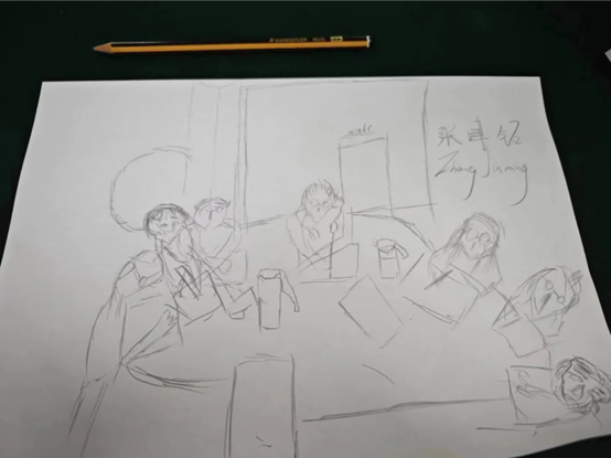 在我们认真绘制校园素描的时候,老师也给我们画了一幅素描画,这幅画最左边的那个人就是当时低头绘制素描的我。随后我们观摩了老师的画作,老师的画作的取景遍布世界各地,其中我最喜欢的就是这幅天后宫的画作,应该是后天我们将前往天后宫进行参观,实地的看一下天后宫是什么样子,学习当地的文化历史。