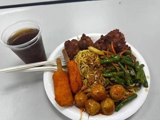 12:00 今天中午的饭菜异常丰盛,四菜一主食,没想到逃离了山东还是没有逃离豆角的魔咒,山东人表示豆角真的吃够。炒方便面上淋上咖喱鱼丸的汤汁拌在一起别有一番风味。此外,餐后水果是龙宫果,这是我第一次吃到这种水果,从外面他就像是一个小土豆,但剥开里面是一瓣一瓣的透明果子,有一丝丝不算特别浓的甜味,味道相对来说较为清淡,希望明天还能再吃这个。