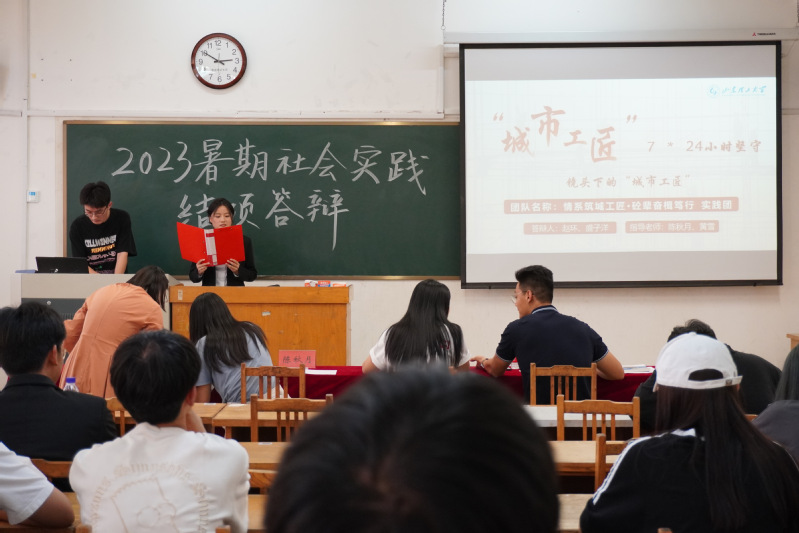 此次答辩会共有八支队伍参加,各实践团队代表成员依次答辩。各组答辩人以PPT、视频和调查报告为载体,围绕实践背景、调研方法、实践过程、实践成果等方面展开陈述。参加答辩的团队的实践主题涉及多个方面,他们或深入乡野,探寻乡村建筑保护与文化传播新策略;或走入革命老区,探析红色基因有效传播路径;或朝都市进发,描绘镜头下的“城市工匠”…