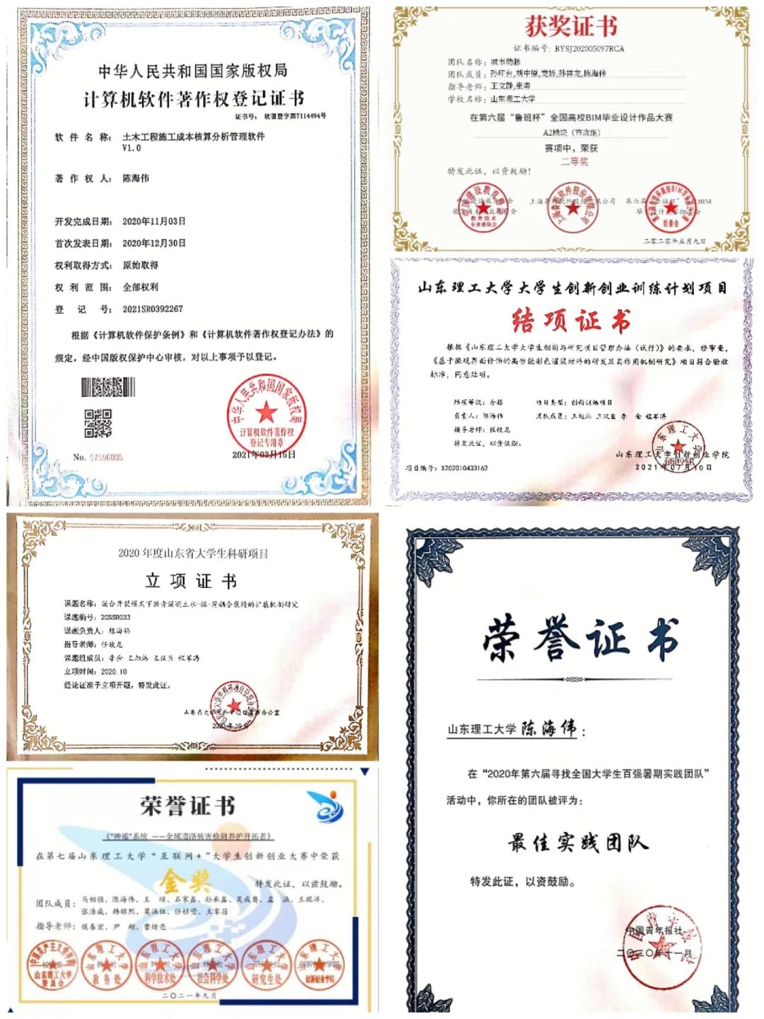 陈海伟,男,中共党员,建筑工程公司土木1806班员工,现任团支部书记,曾任院员工会安全自律中心主任、辅导员助理。思想态度端正,学习成绩优异,大学前三年综合测评成绩专业排名第一,曾获国家奖学金等各类奖学金9项。工作认真负责,曾获山东省“优秀员工”,w66旗舰厅官网“优秀团员标兵”等荣誉称号。积极参加社会实践和科技创新活动,所带实践团队获评2020年全国“最佳实践团队”(全国仅10支),并获山东省“社会实践优秀员工”等荣誉称号。主持山东省科研项目1项,参与创新项目4项,参与纵向课题研究2项,发表学术论文4篇,其中SCI2篇,申请实用新型专利2项、计算机软件著作权1项。累计获得国家级奖励12项,省级奖励9项,校级奖励32项。