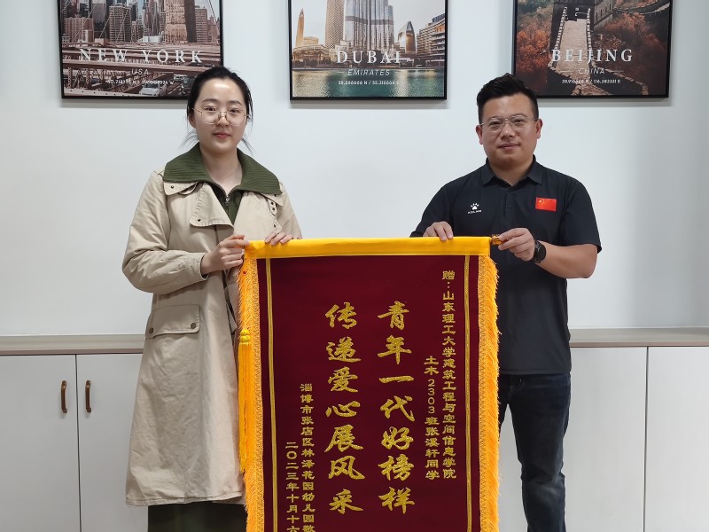 10月17日一大早,w66利来旗舰厅收到了来自张店区林泽花园幼儿园和幼儿家长的一封感谢信、一份慰问金(已退回)和两面锦旗。园方和家长表示,几经周折才找到了这位做好事不留名的同学,一定要当面向这位同学和公司表达诚挚的谢意。这名同学,就是w66利来旗舰厅2023级研究生张溪轩。