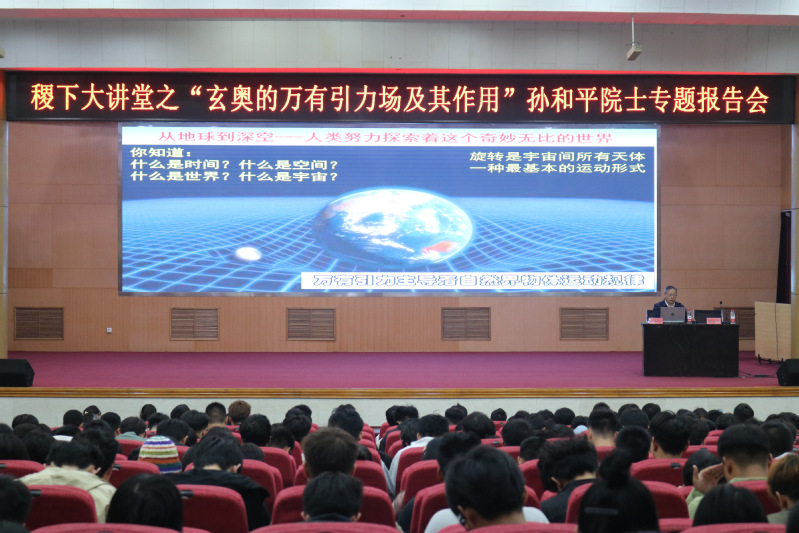 孙和平院士作了题为《玄奥的万有引力场及其作用》的报告。他从时间与空间的基本概念与牛顿万有引力定律出发,介绍万有引力在地球与太阳系形成过程中的作用,介绍地球重力场测量技术及其在国防航空航天、前沿基础研究与国家大型工程建设领域中的作用,讲解地球内部结构、地球自由振荡、地球内核动力学、地震监测、珠峰高程测量、南水北调工程和水下航行器导航匹配等先进知识。结合个人科研经历,孙院士勉励建工学子立志高远、砥砺奋斗、突破瓶颈,成为人生赢家。