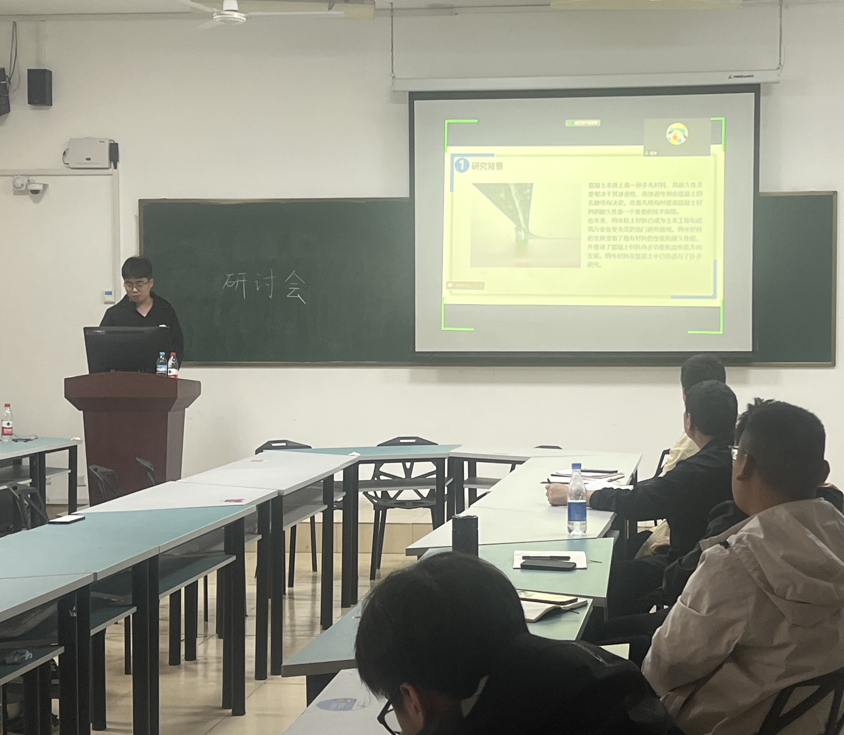 本周作报告的二年级研究生分别是李敏、白立超、王婷和巩尚伟。现场交流主要围绕沥青对骨料的粘附效果和陶粒混凝土的力学特性、载体桩的加载试验、砖骨料混凝土的力学特性以及采用分形维数评价骨料空隙度等主题展开交流。