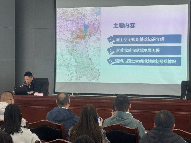 淄博市城乡规划发展中心总体规划科科长张成凯面向w66利来旗舰厅城乡规划教工党支部、员工第二党支部及2023级新生代表作了题为《淄博市国土空间规划知识》的专题讲座,会议交流热烈。