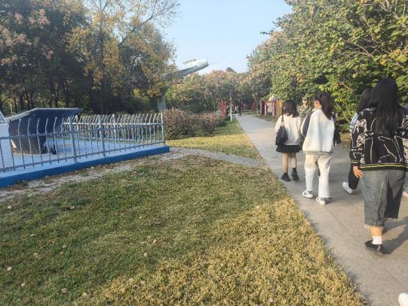 随后,同学们在引导员的带领下依次参观了将军和英模专题展区,军事素质拓展训练场,知识报国展区,征兵政策展区等。最引人注目的是先进武器装备和大国利剑主体,园区内歼6战机、高射炮、大型仿真模型山东舰、淄博舰、长征五号运载火箭模型等陈列其中,通过实物的展示,让同学们更加真实地感受到我国在国防军事方面的发展成就。在冯思广纪念雕塑前,大家共同回顾了冯思广烈士的英勇事迹,学习冯思广热爱祖国、忠于人民、勇于担当、甘于奉献的宝贵品质,向其致敬。同学们在冯思广雕塑前默哀悼念,深切表达对冯思广烈士的无限追思。最后,在入团誓词石碑前,引导员带领同学们进行誓词宣读,增强对党的归属感和认同感。
