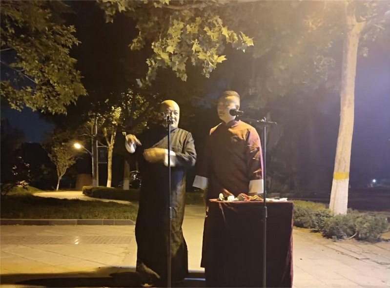 活动伊始,报幕人周杰上台,对观众们的到来表示热烈的欢迎,并宣布路演正式开始。首先亮相的是我社两位资深演员常瑞娟、周杰带来的相声《规矩论》,两位演员凭借深厚的表演功底和风趣的言语,吸引众多观众驻足,营造了现场热闹的气氛。紧接着便是由曹子怡和崔冬梅这一对年轻拍档为我们带来了《对春联》的精彩表演,他们表演自然,语言生动活泼,引得现场笑声不断。随后,我社两位经验丰富的拍档徐志鹏、韩琪为我们带来经典相声节目《铃铛谱》,两位演员幽默的表演使这一传统节目焕发出了新的生机与活力,引得现场观众捧腹不禁,现场气氛推向高潮。随后我社成员已毕业的两位资深老演员王义杰、张家豪回到母校为本次路演加油助力,两位资深演员展示了他们高超的表演技艺,带来了是传统相声《满腹经纶》,不仅现场观众反应热烈,我社成员更是赞叹不已。紧接着便是张世豪,王万松两位相声演员又为我们带来相声曲目《相声小段》,谢宇健和陈昭然两位功底深厚的演员带来了他们的拿手曲目《学外语》,他们的精彩表演再一次点燃了在场观众的热情。最后,由我社成员连昕和杨依超带来的节目《保安队长的日子》,他们的表演热情洋溢、引人入胜,为路演活动画上圆满句号。